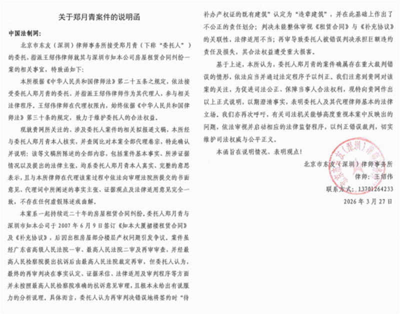 - 北京市东友(深圳)律师事务所关于郑月青案件的说明函