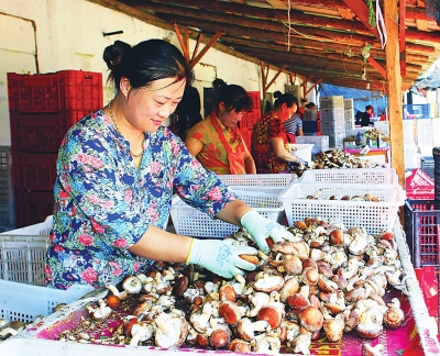 近年来,集安市清河镇食用菌种植面积不断扩大,品种不断优化,经营主体也由过去单一的农户种植向企业、合作社延伸,香菇产业逐渐成为当地农民增收的一项主要产业。图为森源食用菌公司的几位员工...